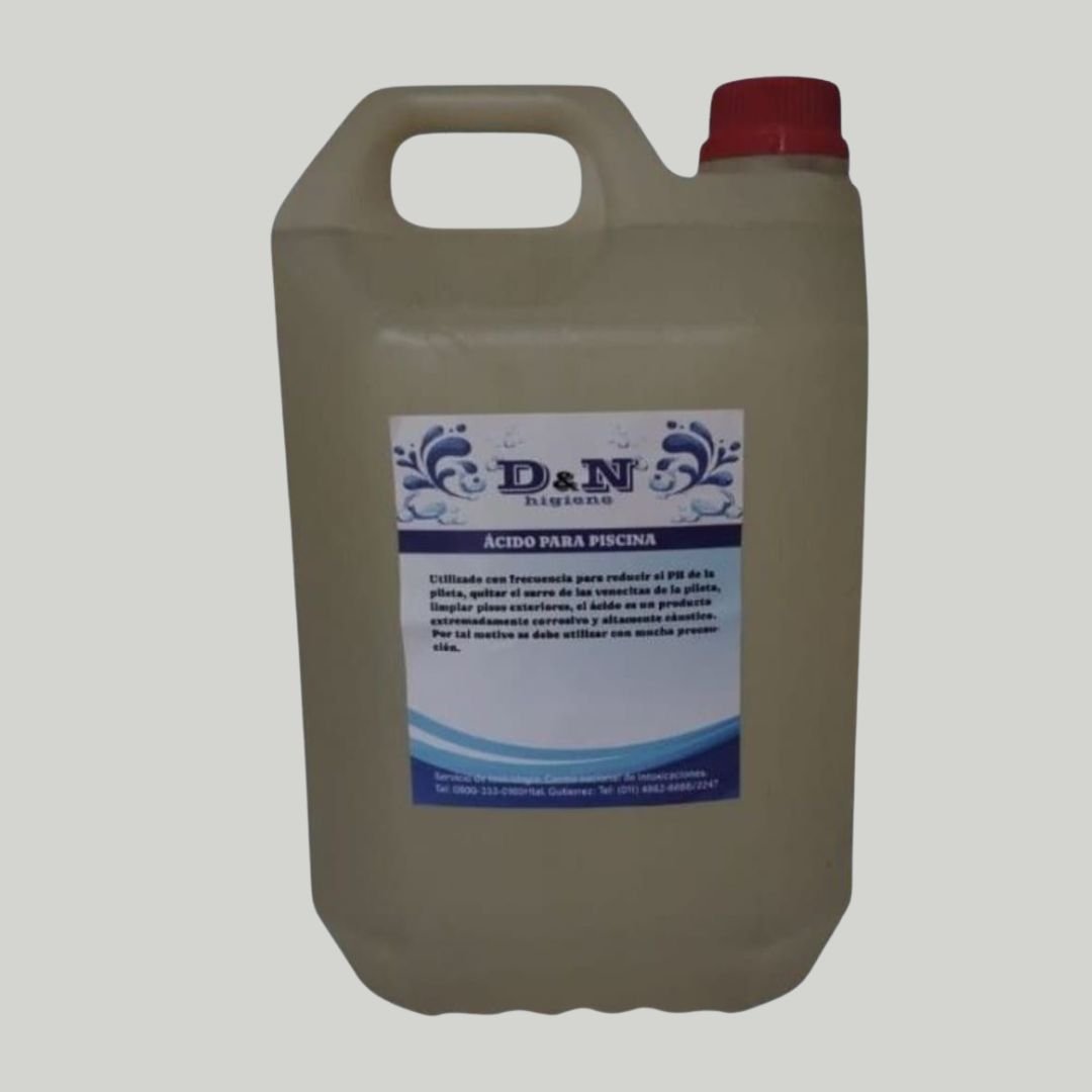 El ácido para piscinas en presentaciones de 5L y 20L es el aliado perfecto para mantener el agua de tu piscina cristalina y libre de impurezas. Diseñado para equilibrar el pH y eliminar residuos, este producto asegura una limpieza eficaz y profesional.